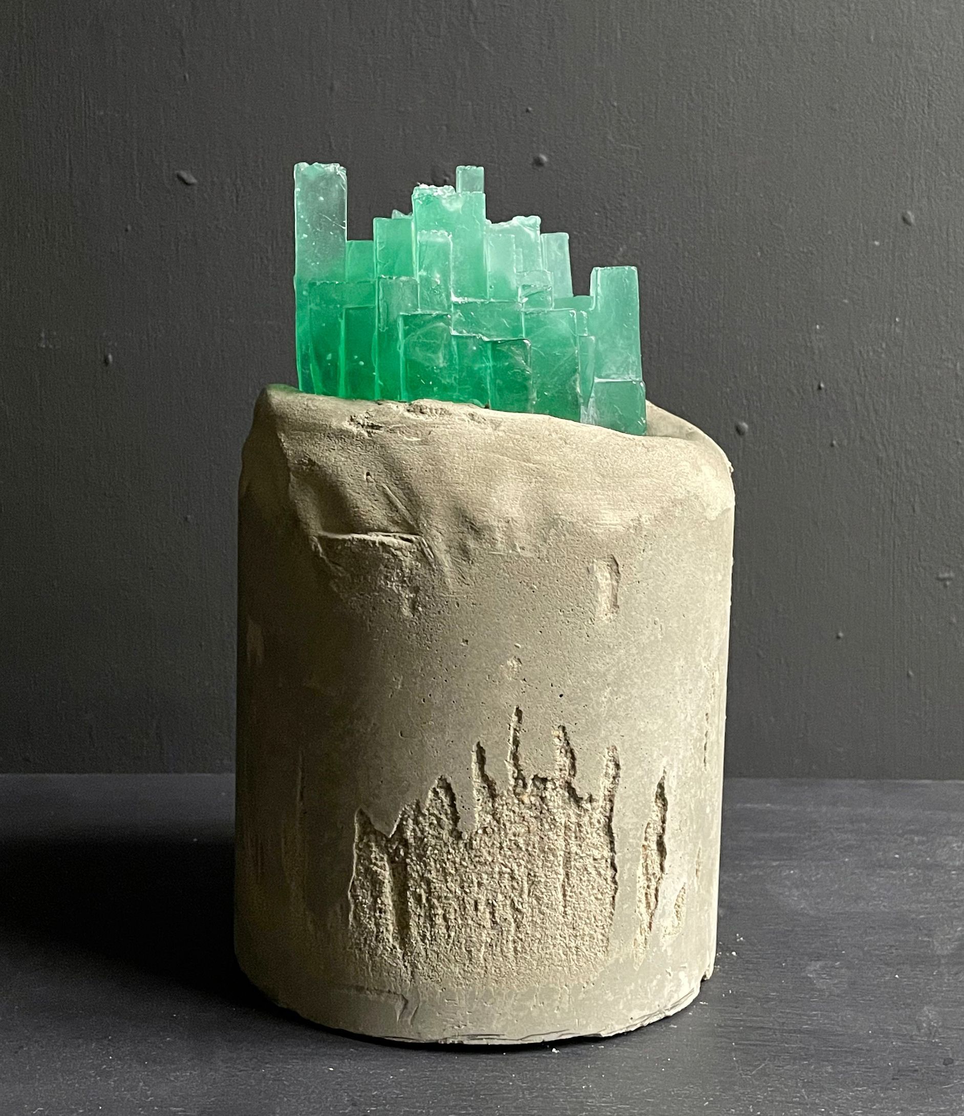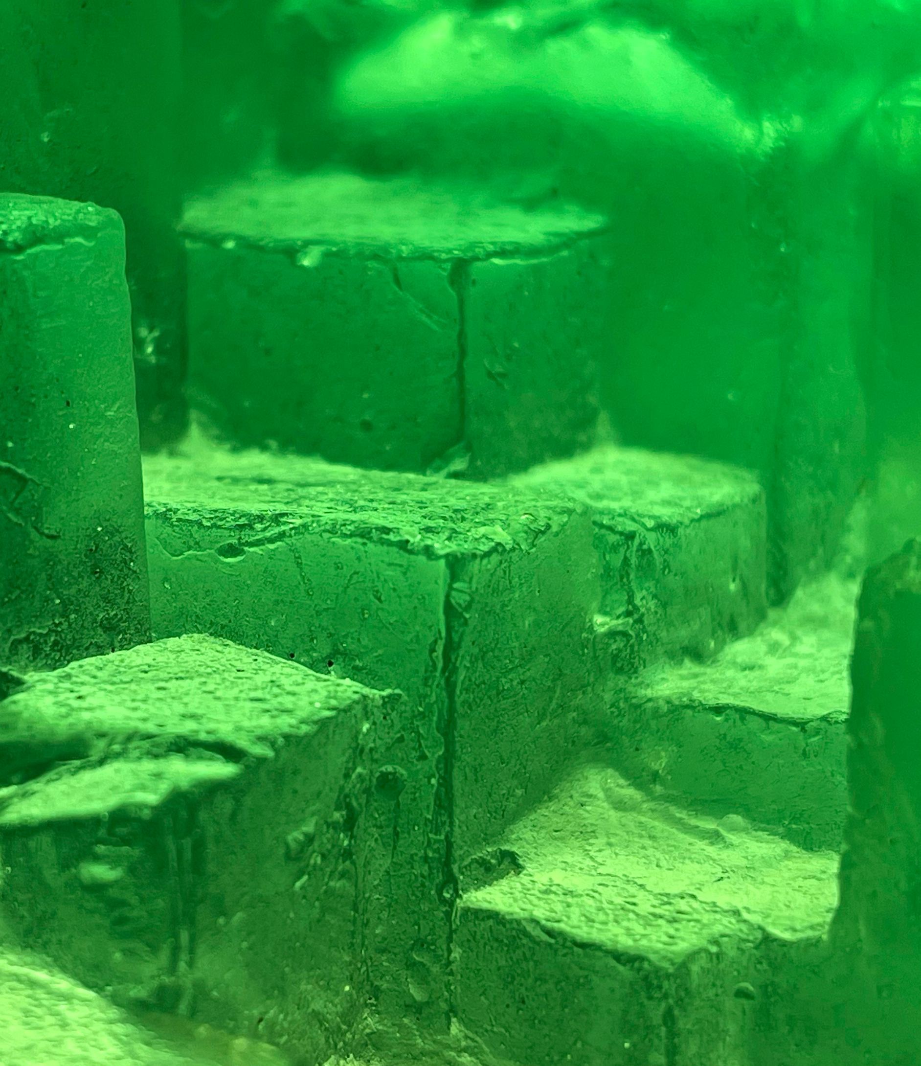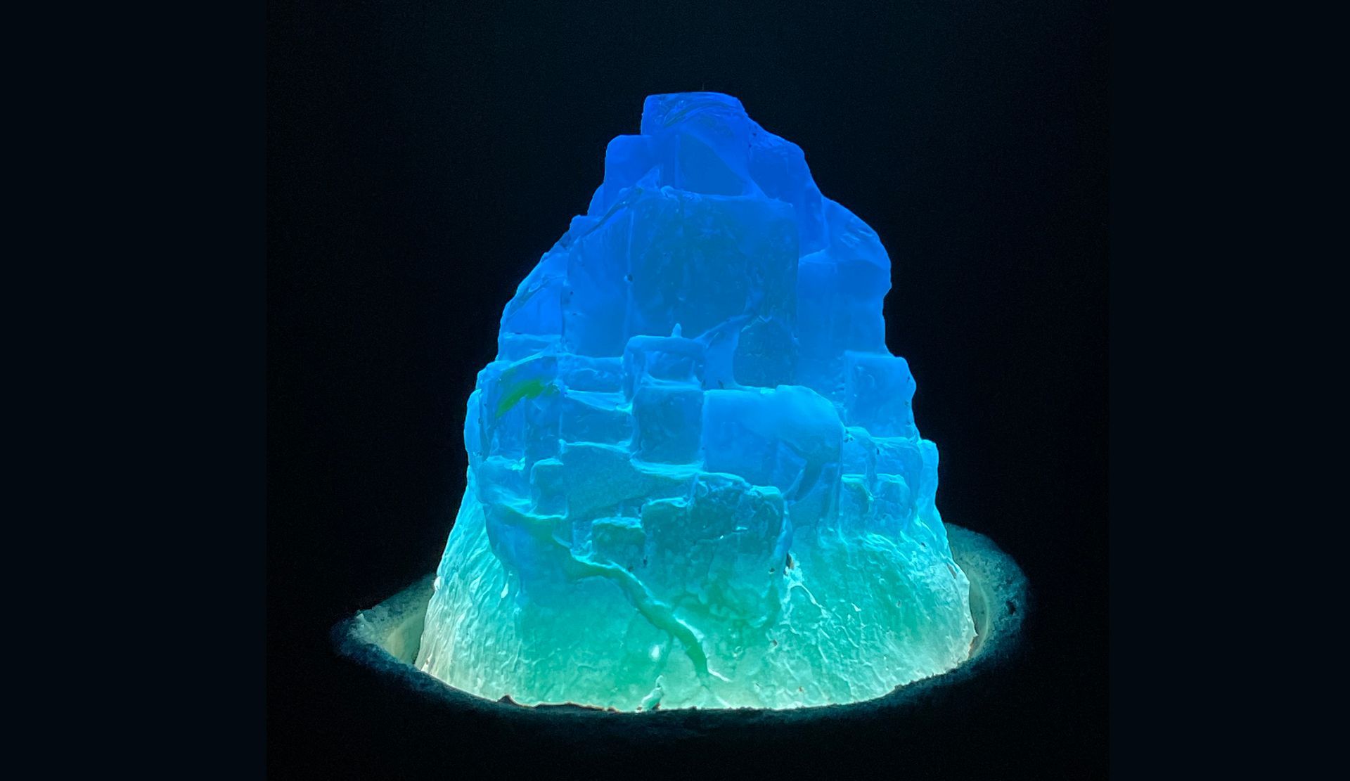 De kleur van glas hangt samen met de mineralen die het bevat. In het volgende object zit kobalt, dat maakt het blauw. Plus een miniscuul beetje uranium, waardoor